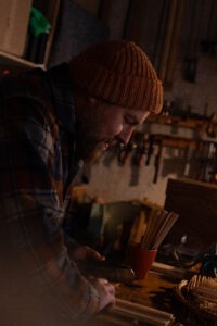 He also reconsidered the material itself, starting to follow the way the wood resists or redirects his intentions. “I trained originally in such a controlled environment with big machinery and it was like making the wood submit. I draw on some of those techniques, but I’m much more sympathetic to the material.” For example, if a future spoon handle resists a line-following axe blow, he allows himself to be led along new strokes by the wood instead.
